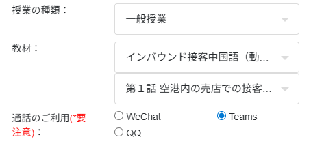 レッスン予約時には、授業の種類:一般授業を選択して、教材:インバウンド背客中国語 を選択してください。以下参考にしてください。